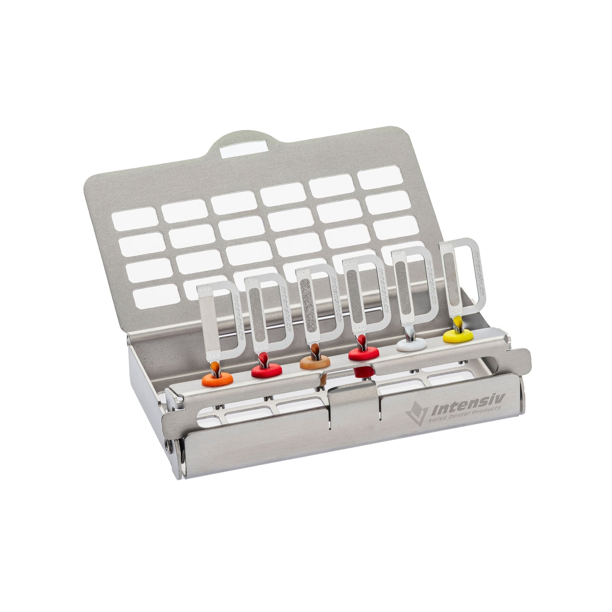 Intensiv Ortho-Strips Tray 400 Set is for the aligner treatment and follows a IPR protocol. It also contains the new, patented Intensiv Ortho-Strips System, Central. Thanks to the diamond coating in the central operating area, the Intensiv Ortho-Strips System, Central allows for high precision in the approximal reduction, finishing and polishing of enamel, respecting the original morphology and dental tissue.