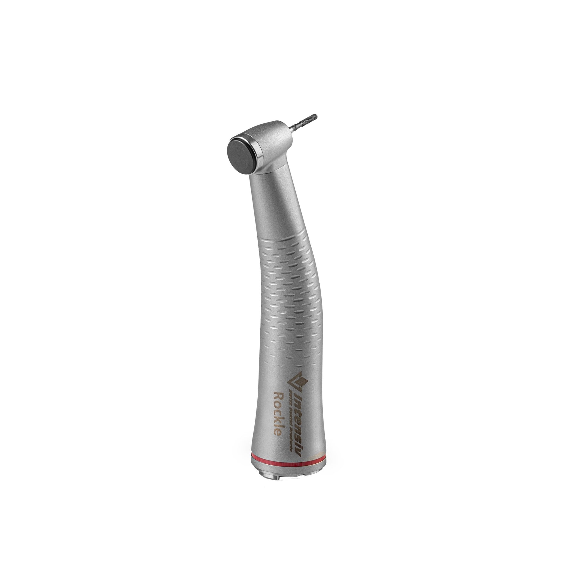 Intensiv Rockle is a special red ring contra-angle handpiece with standardised ISO coupling, water spray and integrated light. The more powerful internal micromechanics are unique.